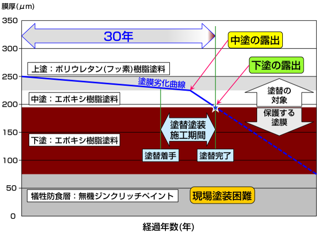 本州四国連絡橋の海峡部の塗装は、下地に厚膜型無機ジンクリッチペイントを使用した重防食塗装を採用しています。このジンクリッチペイントは、現地で塗替が困難なため、下塗りの損耗が始まる前に、中塗・上塗の塗替を行っています。