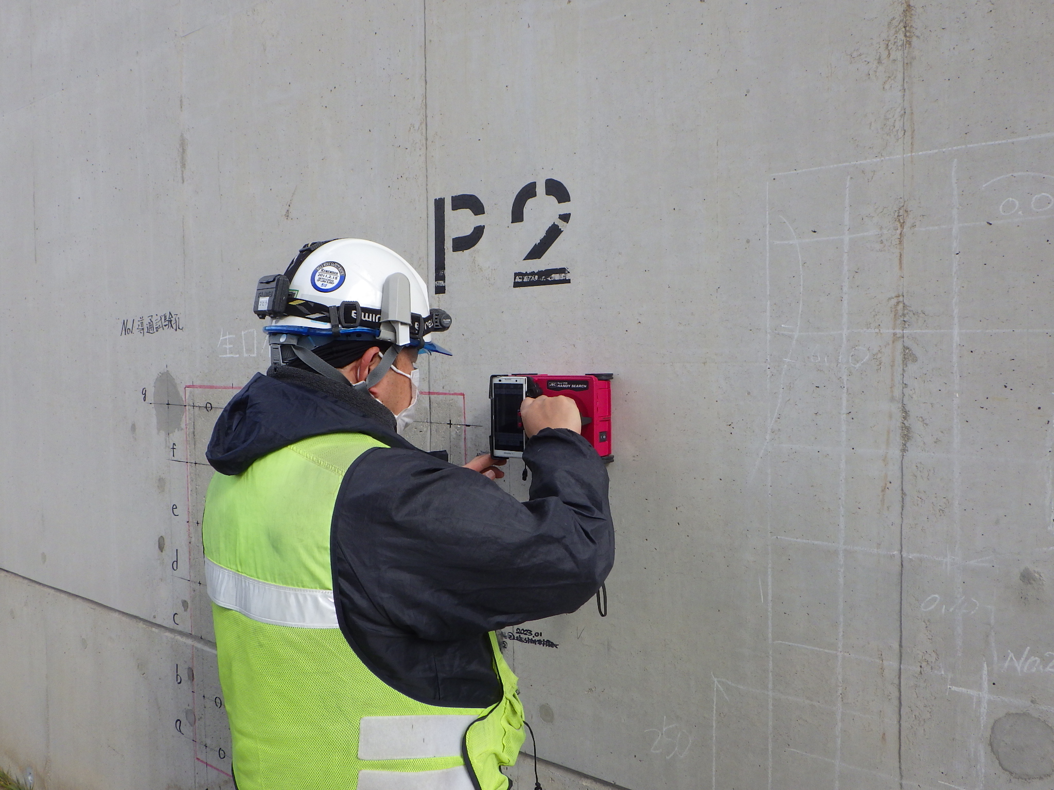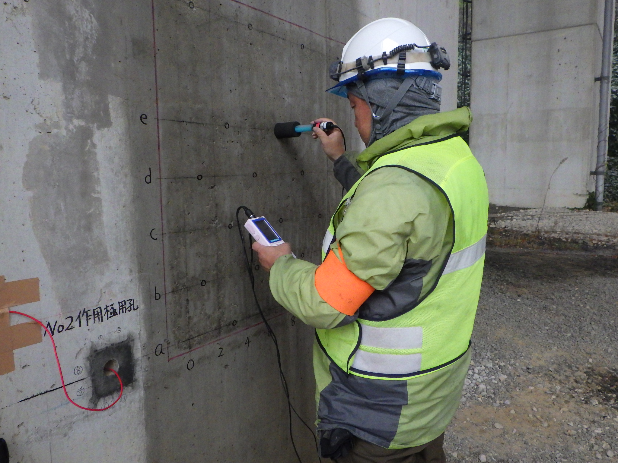 海峡部のコンクリート構造物は非常に厳しい塩害環境にあり、200年以上の 耐用年数を確保するには、コンクリート構造物に対しても塩害対策が必要となります。このため定期点検にコンクリート非破壊検査を実施し、中性化の 進行状況、塩分の浸入量等を把握して、劣化予測を実施しています。対策は予防保全に徹した、最も経済的な表面処理工法が採用されています。