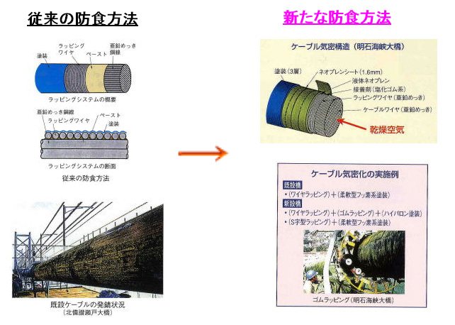 その重要なメインケーブルを錆から守るため、全く新しい防錆技術「ケーブル送気乾燥システム」を本州四国連絡高速道路株式会社とともに開発しました。