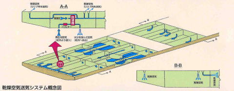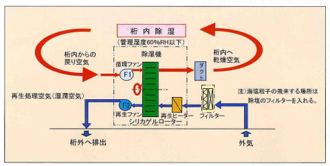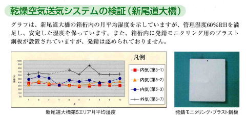 乾燥した空気を送り、発錆を防止する防食システム工法です。この工法により、初期塗装費の削減・塗り替え塗装費の削減など、ライフサイクルコストを縮小することができます。