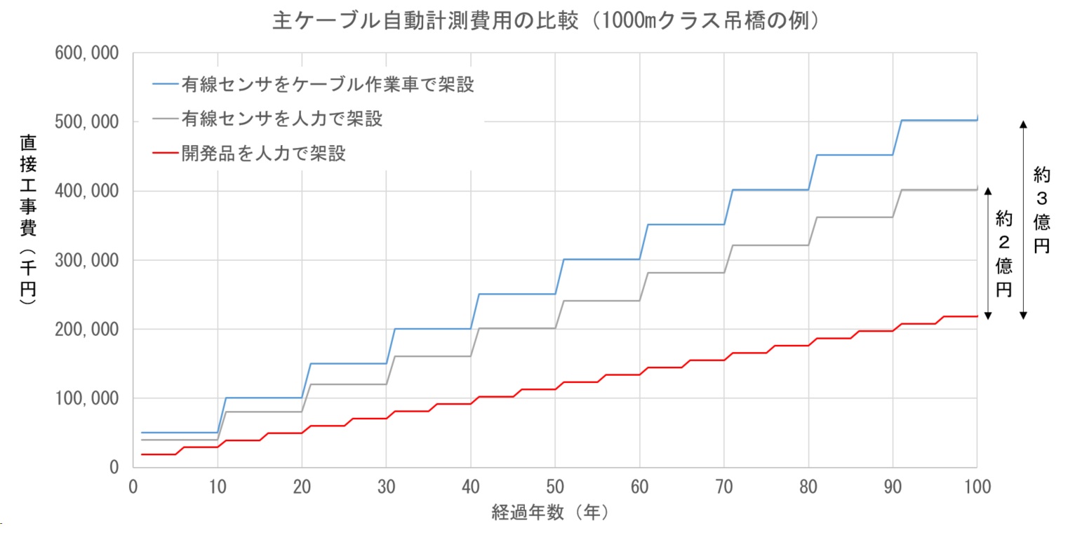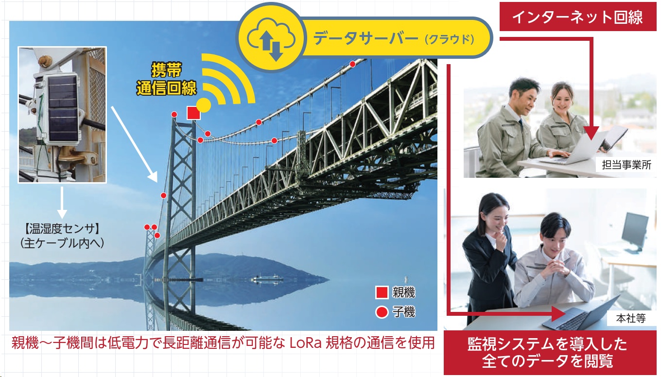 国内外の長大吊橋で採用されている「ケーブル送気乾燥システム」において、主ケーブル全体の相対湿度が管理基準値(40%RH以下)を満たしていることを確認することが最も重要です。従来の確認方法は有線のセンサによる自動計測が主でしたが、多くの費用を要していました。そこで近年発達している最新のloT技術を活用し、新たなケーブル送気監視システムを開発しました。
