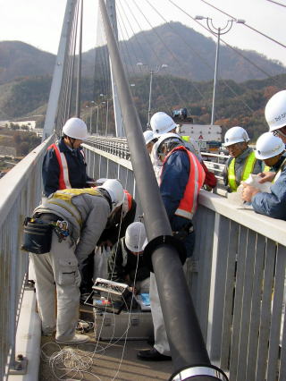 長大斜張橋のケーブル張力測定は、従来、ケーブルの常時微動から1次もしくは2次の固有振動数を測定して、別途実験室等で得られた曲げ剛性を用いて算出するのが一般的でしたが、被覆材と一体となったケーブル剛性の評価が困難であったり、常時微動における低次のモード自体、その判別が困難で長時間の測定が必要になる等の改善余地を残していました。