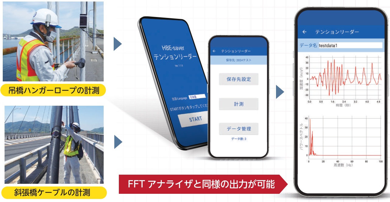 吊形式橋梁の健全性を把握するための重要な項目の一つとしてケーブル張力の計測があります。従来の張力計測では、大掛かりな設備が必要であり、多くの時間と費用を要していました。そこで、加速度計が内蔵され高い計算能力を有するスマートフォンで、ケーブル類の張力を計測するシステムを開発しました。これにより、現地作業効率が向上し、落下リスクも大幅に軽減されました。