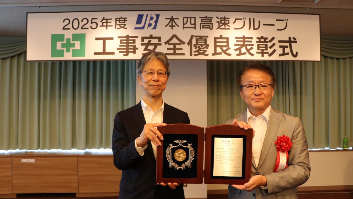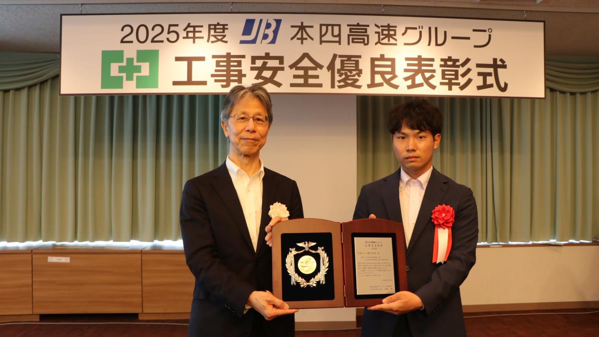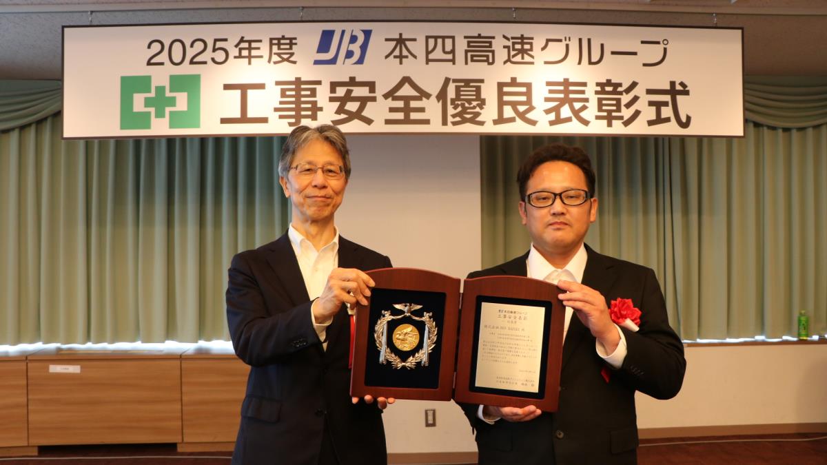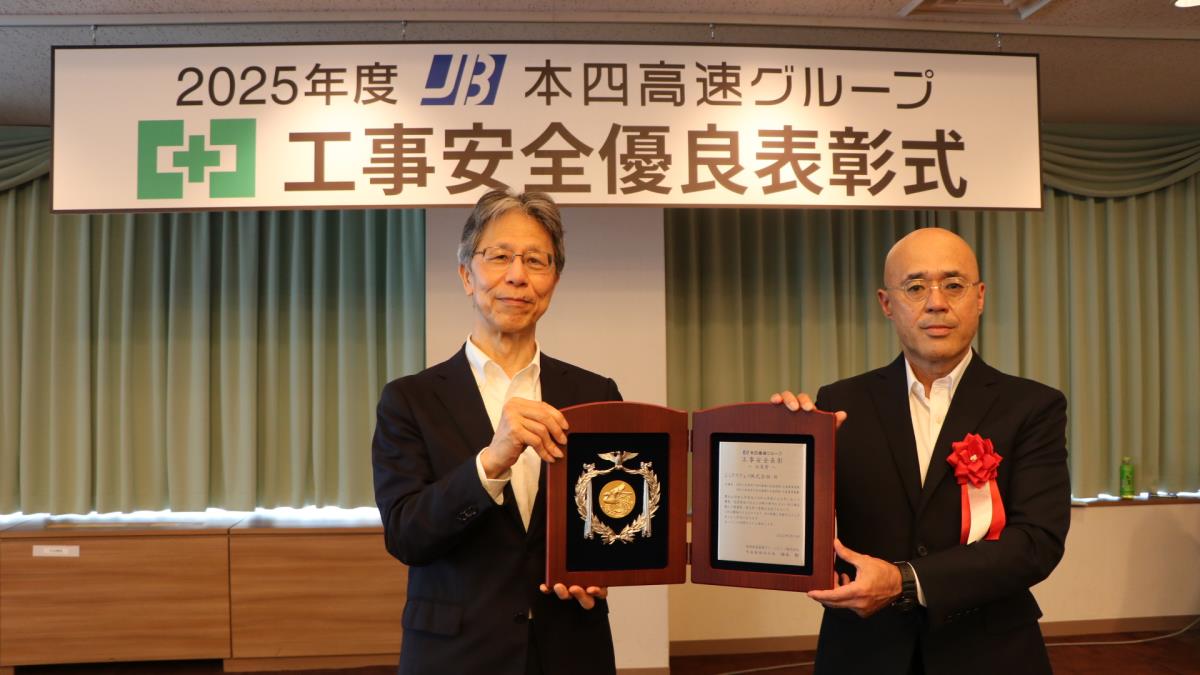 2025年6月19日に本州四国連絡高速道路株式会社と合同で「2025年度JB本四高速グループ工事安全優良表彰式」が行われ、当社代表取締役社長 福永 勧より表彰状を授与いたしました。