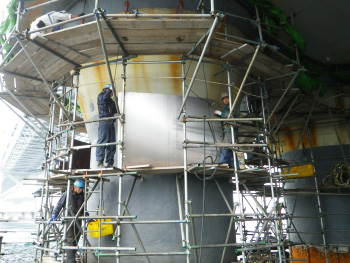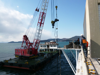 なお、作業現場は海上部・高所といった施工環境となることから、作業車やゴンドラ、仮設足場等を用いながら、安全な作業環境下で各種作業を行っています。