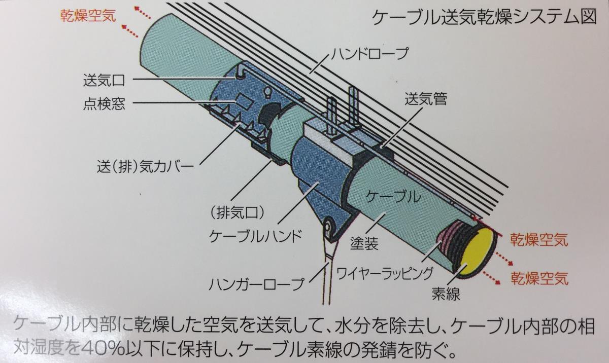 吊橋の命であるメインケーブル。その重要なメインケーブルを錆から守るため、全く新しい防錆技術「ケーブル送気乾燥システム」を本州四国連絡高速道路株式会社とともに開発しました。当社が施工するシステムは国内外の後発吊橋にも適用されています。
