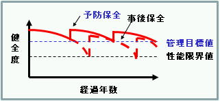 構造物の管理手法として予防保全と事後保全の考え方がありますが、本四連絡橋は予防保全の思想で管理を行っています。この予防保全は 構造物が性能低下を引き起こす前の劣化初期段階で補修を行い、経済的に長寿命化を図る方法です。