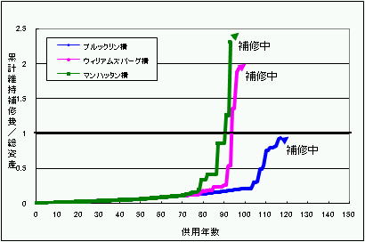図は橋の補修費の累積と建設費との関係を示したもので、1975年以降急激に増加しています。これは必要なメンテナンスを行わなかったためで、既に建設に要した費用の2倍が投入されています。日常の管理をおろそかにした結果であり、我国の橋梁管理の貴重な教訓となっています。