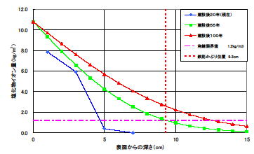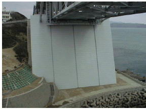 海峡部のコンクリート構造物は非常に厳しい塩害環境にあり、200年以上の 耐用年数を確保するには、コンクリート構造物に対しても塩害対策が必要となります。このため定期点検にコンクリート非破壊検査を実施し、中性化の 進行状況、塩分の浸入量等を把握して、劣化予測を実施しています。対策は予防保全に徹した、最も経済的な表面処理工法が採用されています。